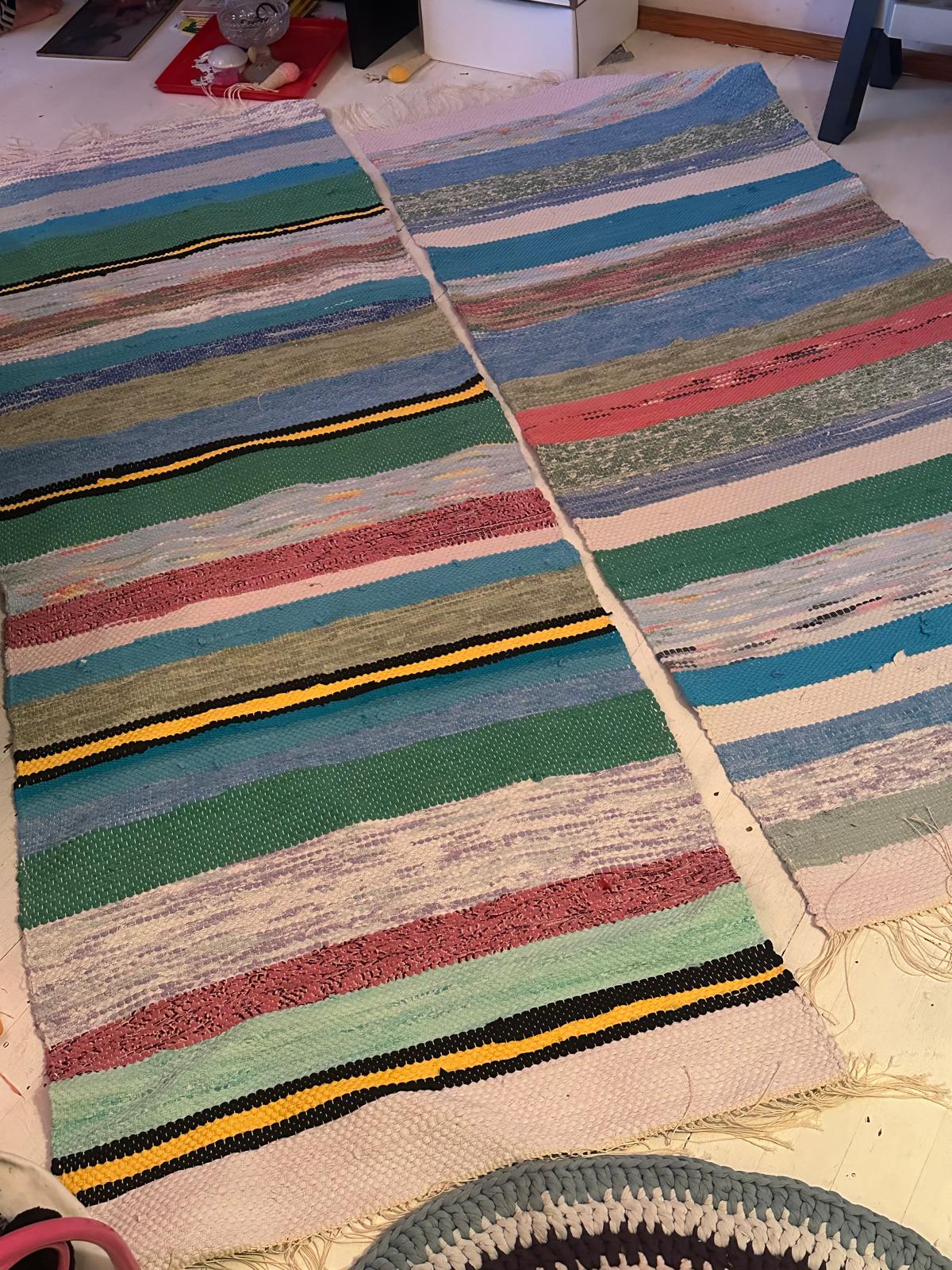 On muuten jännä miten värit muuttuvat matossa ollessa. Lähes kaikki kuteeni omiin mattoihin oli vaaleanpunaisen sävyjä (keltaiset ostin paikan päältä) mutta valmiissa työssä osa näyttää liloilta jne. Samoin tyttäreni matot näyttää tummemmilta kuin luonnossa mutta ehkä valoitus ei ole aivan täydellinen tuossa 🤔